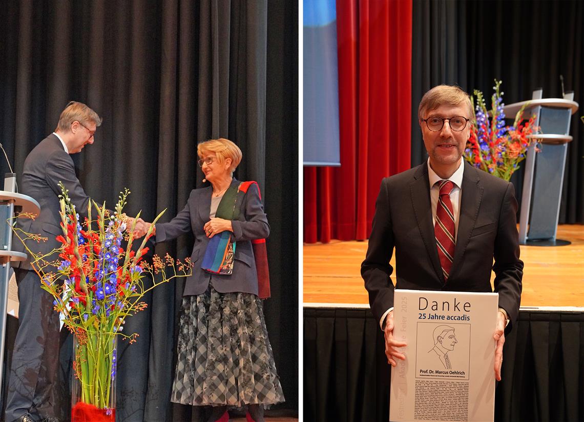 Prof. Oehlrich feierte in diesem Jahr sein 25-jähriges accadis-Jubiläum. Gerda Meinl-Kexel würdigte sein herausragendes Engagement, seine Leidenschaft und seine Treue zur Hochschule. Als Dankeschön überreichte sie ihm ein einzigartiges Kunstwerk: ein abstraktes Portrait, das die Namen aller Studierenden der Abschlussklasse 2025 trägt - ein Symbol für die enge Verbindung zwischen Professor und Studierendenschaft.
